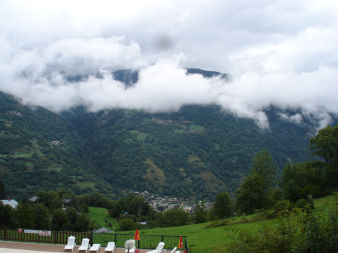 Temps épouvantable sur la route (pluie, grêle)... Au plus on approchait du club, au plus le ciel devenait noir. L'apocalypse. Et en arrivant, c'est à pleurer de rire. L'hôtel fait assez inquiétant vu comme ça de l'extérieur, on dirait celui du film Shining, avec le cimetière à côté et la brume sur les montagnes... Ça me donne quelques idées d'impro le lendemain pour le spectacle, en précisant que Courchevel est en Transylvanie et que Igor est venu nous accueillir à l'entrée, prétextant que le maître (Jean-Phi, le directeur), n'est pas levé car il ne sort de sa tombe qu'à partir de minuit. Gros moment.