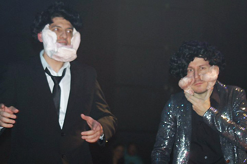 M'enfin je crois que le clou de la soirée pour nous aura été notre interprétation des frères Bogdanoff. Déjà en préparant la soirée avec Benjy, on cherchait des idées et j'ai eu le flash de ce duo extraterrestre du PAF. Rien qu'à imaginer nos tronches, on riait déjà. Le plus dur aura été de faire les "masques" (des prothèses en argile, peintes à l'acrylique et tenant par une perruque). On s'est cassé le cul, mais c'était au final tellement ridicule qu'on a eu un vrai fou rire sur scène. Je peux même dire qu'Ambroise (qui découvrait les costumes en même temps que le public) n'a pas pu dire le texte prévu tellement on pleurait. Un grand moment de n'importe quoi, mais qui va devenir culte (enfin pour nous, hein !)