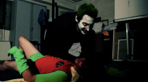 En fin de compte, ces soucis de maquillage nous ont plu. Le Joker a eu des tas d'origines et des tas de look. Le nôtre est entre la version Nicholson (un dément défiguré à la peau colorée par les produits toxiques) et la version Ledger (un fou qui se maquille), avec donc un maquillage qui fond au fur et à mesure des séquences... Pour Robin, on s'est beaucoup interrogé. Ce qui passe en BD passe moins à l'écran et évidemment, le costume très kitsch de Robin n'est pas forcément le plus judicieux, mais par rapport à la BD, perso, je tenais à ce que le design soit le même. Fan de comics vintage, je ne voulais pas trop qu'on parte sur le look moderne de Robin, comme dans le film "Batman, under the red hood", qui tranche avec le look d'antan. Max était pas trop client, mais moi j'aime bien, même si il y a un côté un peu ridicule qui est en totale opposition avec le contenu et j'aime assez cette opposition. C'était aussi le bon prétexte pour avoir de belles couleurs flash et trouver le bon étalonnage n'a pas été une partie de plaisir non plus.